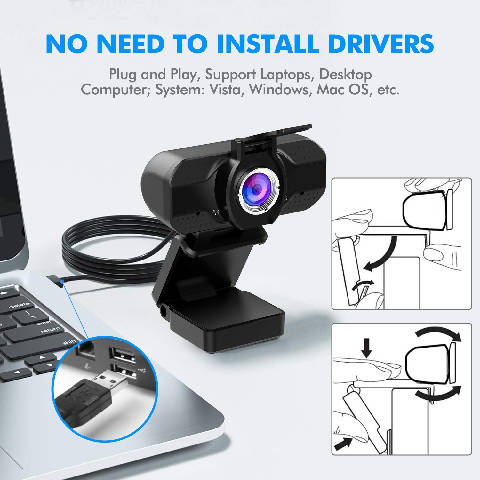 Webcam 1080P com microfone, tripé e capa de privacidade